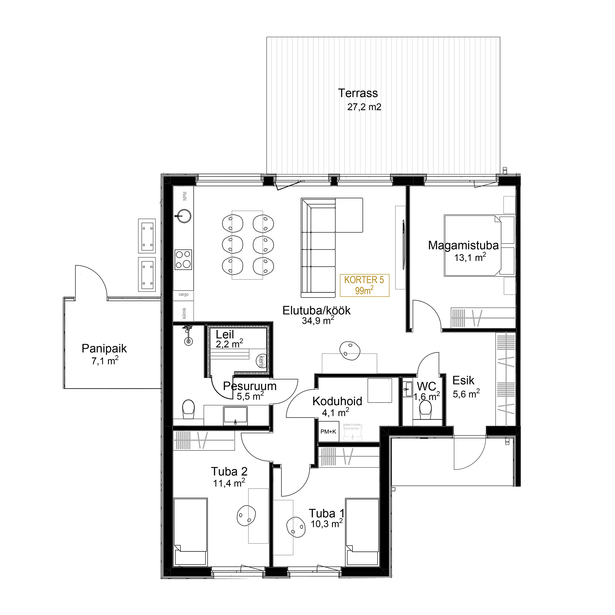 Iga ridaelamu boksi arhitektuur keskendub funktsionaalsusele, säilitades samal ajal maksimaalse valguse, avaruse ja kõrgete lagedega disaini. Ühekorruseline planeering tagab mugava ja kaasaegse elukeskkonna, kuhu kuulub lisaks avatud köök-elutoale kolm hubast magamistuba, tualett, vannituba koos saunaga ning koduhoiuruum. Elutoast pääseb hoovialale, kus asuv avar terrass pakub suurepärast võimalust päikese käes aega veeta ning on ideaalseks paigaks nii pere kui sõpradega ühiste hetkede nautimiseks. Aias asub ka mugav eraldiseisev panipaik.